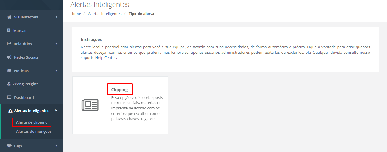 Para configurá-lo, você deve clicar na opção do menu lateral Alertas Inteligentes > Clipping.