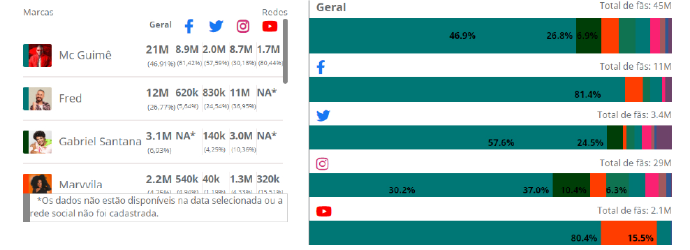Apesar de não ter o melhor Zeeng Score, Mc Guimê possui o maior número de fãs nas redes sociais. Com uma soma de 21 milhões, tem seu maior público no Facebook e Instagram.