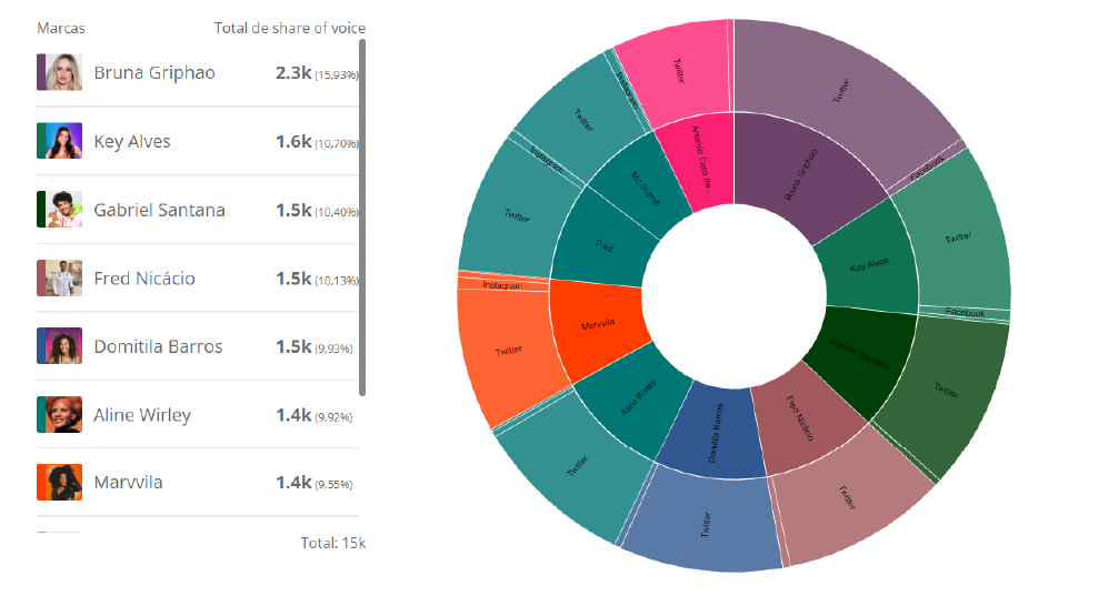 A atriz, Bruna Griphao foi a participante mais presente nas redes sociais, com foco em interações no Twitter. Assim, a sister realizou 2.3k posts no período analisado.