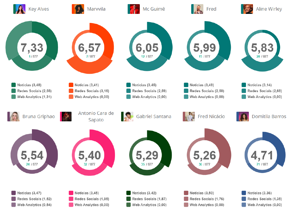 Entre os participantes do grupo camarote, quem teve o melhor desempenho geral foi Key Alves, com pontuação de 7,33 no Zeeng Score.