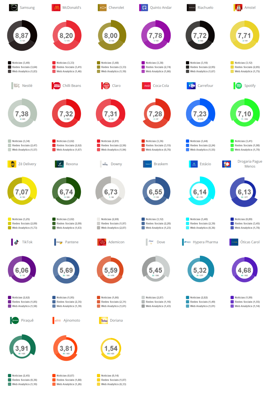 Entre as marcas patrocinadoras do #BBB23, quem tem o melhor desempenho geral é a Samsung, com pontuação de 8,87 no Zeeng Score. Desse modo, a empresa garante uma boa performance em todos os indicadores analisados.