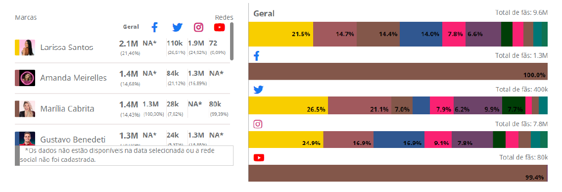 O Ativo Social é a soma de todos os fãs de cada participante, analisando o volume de seguidores no Facebook, Instagram, Twitter e Youtube.