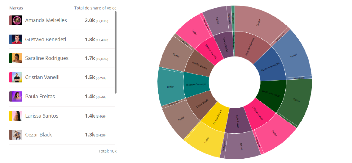Dessa vez, quem se destaca é Amanda Meirelles. Agora, sendo o participante mais presente nas redes sociais, com foco em interações no Twitter. Assim, a sister realizou 2k posts no período analisado.