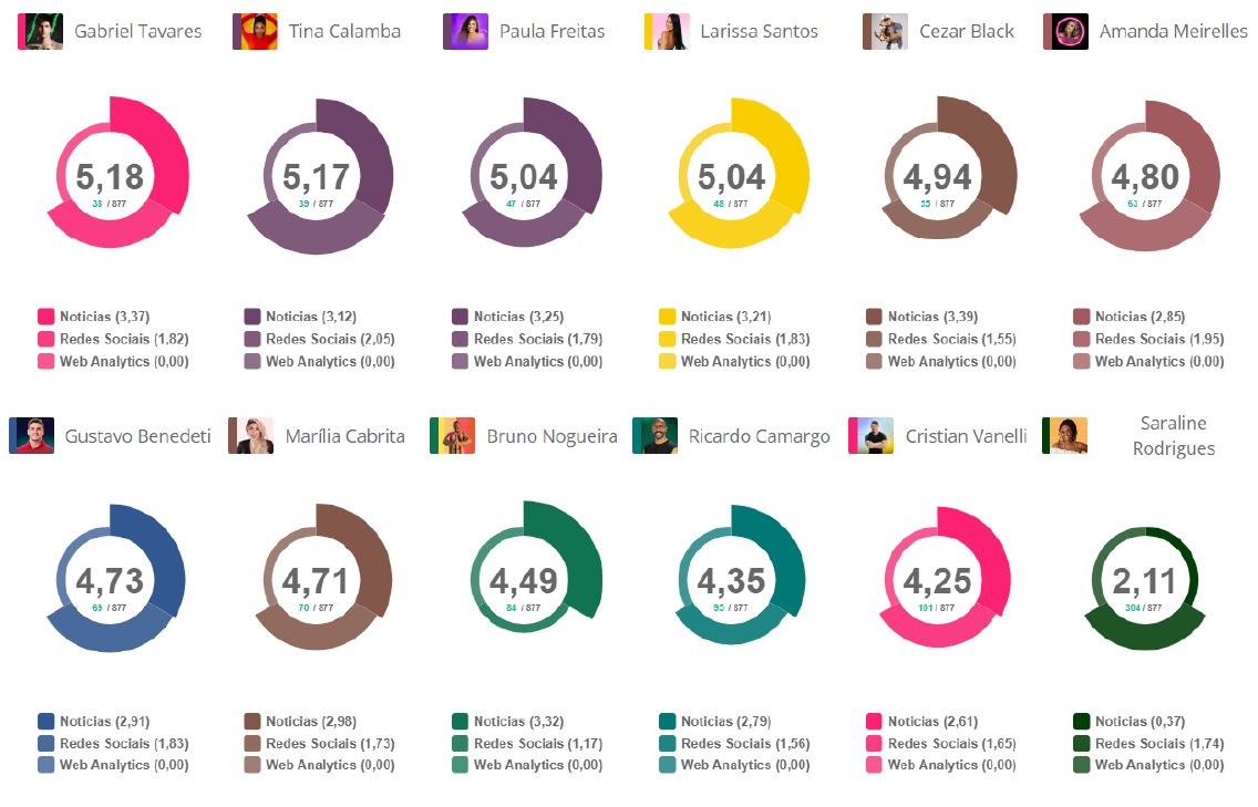 Entre os participantes do grupo pipoca, quem tem o melhor desempenho geral foi o Gabriel Tavares, com pontuação de 5,18 no Zeeng Score. Desse modo, o brother se destacou nas métricas de Notícias e Redes Sociais.