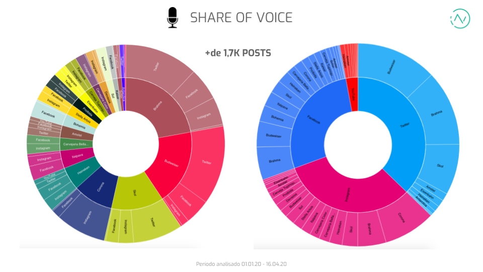 O Gráfico de Share of Voice mostra quais são as marcas que mais estão postando e quais as redes mais utilizadas dentro do segmento monitorado.
