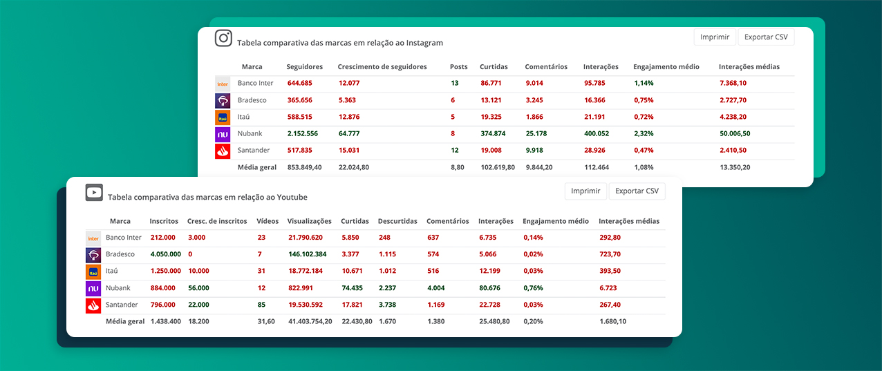 Você também pode fazer relatórios comparativos entre dois períodos e analisar a evolução da sua marca e dos competidores no decorrer do tempo, entendendo assim pontos de atenção e de melhorias na sua estratégia. Ah, e ainda consegue compartilhar esses relatórios com a sua equipe e clientes e debater juntos onde precisam atuar.