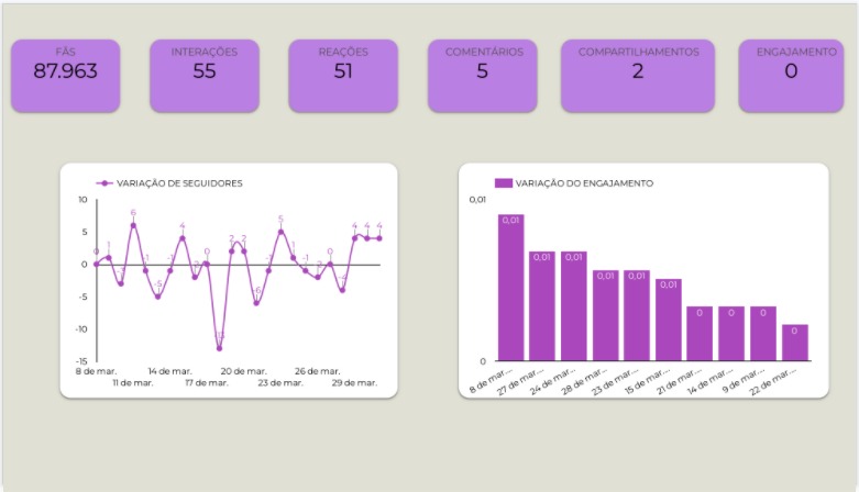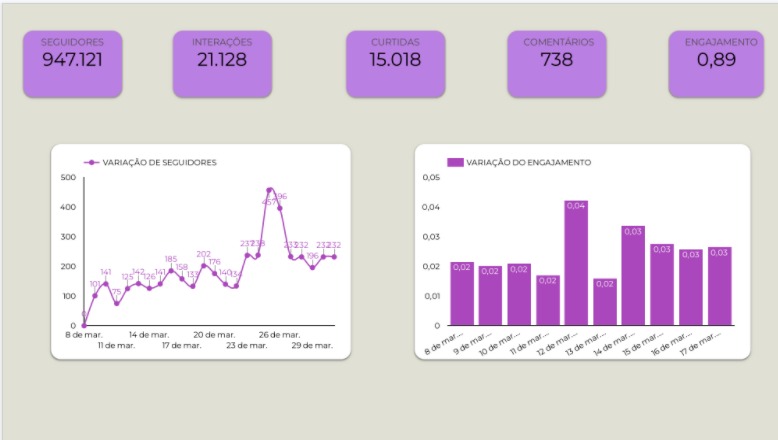 Este dashboard foi construindo para simplificar a visualização do crescimento orgânico do perfil no Instagram e do Facebook e foi personalizado com a identidade do cliente.