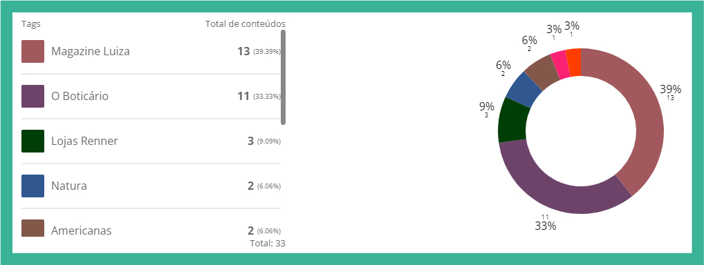 Entretanto, é importante ressaltar que aproximadamente um quarto das postagens realizadas no período foram relacionadas ao Dia das Mãe. Ou seja, neste caso quem mais realiza postagens é o Magazine Luiza, com 26,87% do conteúdo comemorativo.