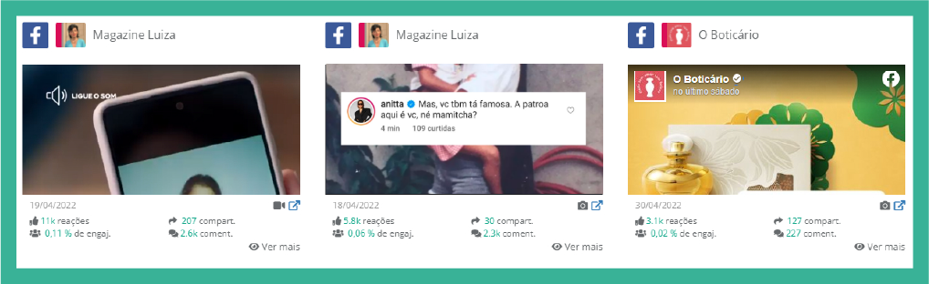 Em seguida, temos Magazine Luiza e O Boticário marcando presença no Top Posts por volume de interações.