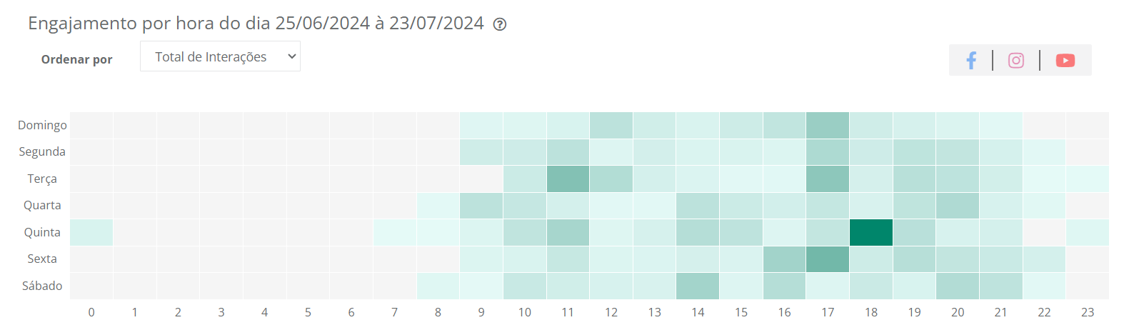 Dentro da Home , você entende quais foram os dias e horários em que as publicações foram feitas e tiveram mais interações dentro das redes sociais, usando o gráfico Engajamento por hora do dia.