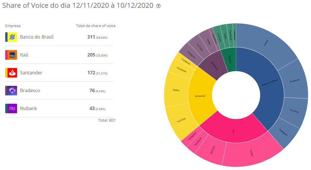 O Share of Voice mostra a quantidade de publicações realizadas pelas marcas monitoradas em cada rede social.