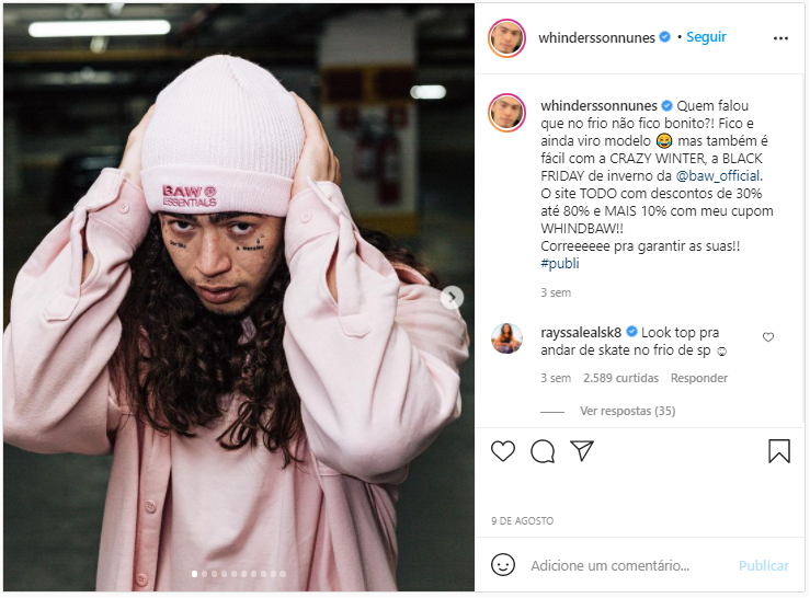 Em primeiro lugar, o humorista e influenciador obteve 2.270.583 curtidas e 12.559 comentários em seu publipost para a BAW CLOTHING. Em percentual de engajamento, garantiu 4,31%.