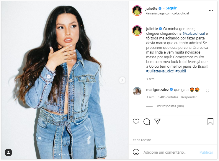 É isso mesmo, ela continua firme no ranking. A influenciadora garantiu 2.054.654 curtidas e 42.591 comentários. O publipost para a Colcci obteve um engajamento percentual de 6,48%.
