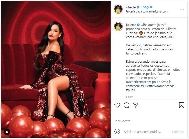 Assim como na posição anterior, Juliette marca presença no ranking. Agora, com campanha para a Americanas. O post rendeu 5,11 de engajamento, 1.611.539 curtidas e 38.929 comentários.