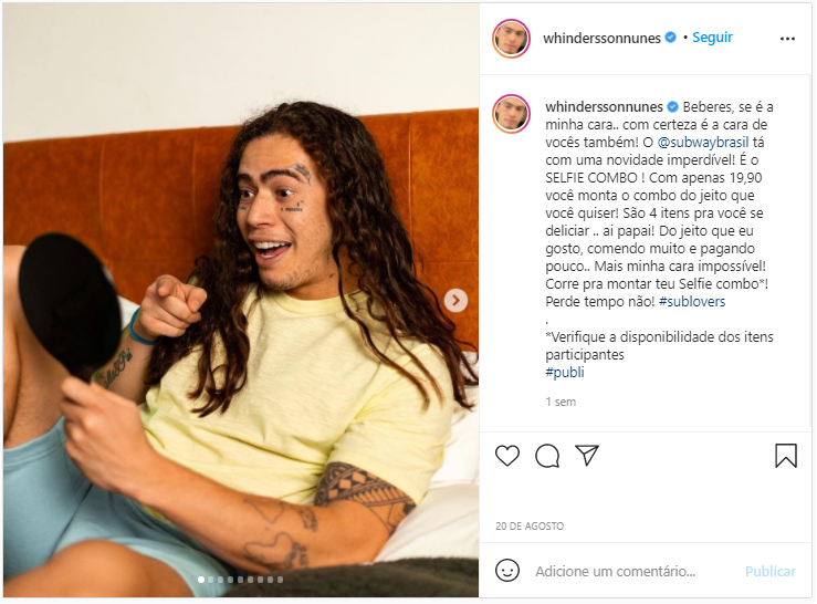 O influenciador aparece aqui novamente com publipost para o Subway. A postagem garantiu 1.486.991 curtidas e 5.403 comentários, gerando 2,81% de engajamento percentual.