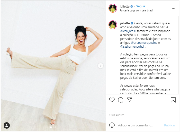 Estou delirando ou é ela aqui mais uma vez? Pois é, Juliette encerra o ranking com campanha para a C&A. A postagem rendeu 1.430.212 curtidas, 26.686 comentários e 4,48% de engajamento percentual.